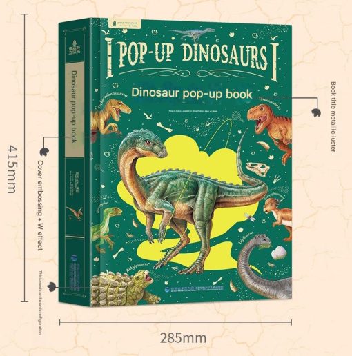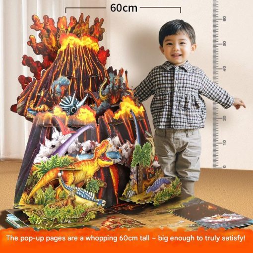 Pop-Up Dinosaurs adalah buku pop up dinosaurus berukuran jumbo dengan tampilan 3D yang sangat besar dan detail. Saat halaman dibuka, ilustrasi dinosaurus dan gunung berapi muncul hingga tinggi sekitar 60 cm, memberikan pengalaman membaca yang interaktif dan mengesankan untuk anak.
