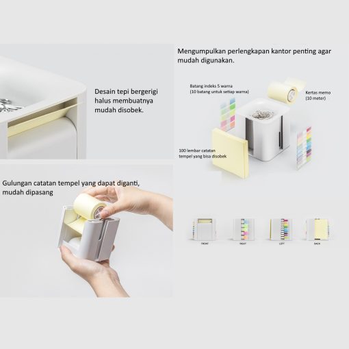 Dispenser catatan tempel multifungsi ini dirancang untuk menjaga meja kerja tetap rapi dan terorganisir. Dilengkapi ruang khusus untuk sticky notes, penanda indeks warna-warni, serta tempat penyimpanan klip kertas, organizer ini memudahkan Anda mengambil perlengkapan kantor dengan cepat dan praktis.