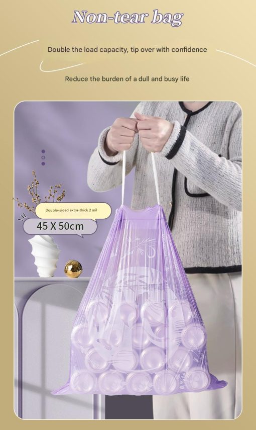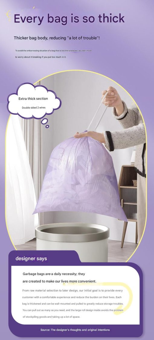 Kantong sampah dengan desain serut praktis yang memudahkan penutupan dan pembuangan sampah tanpa repot. Hadir dengan tampilan bersih dan pilihan gaya yang lucu maupun minimalis, cocok untuk penggunaan harian di berbagai ruangan.