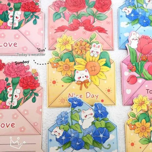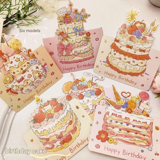 Kartu ucapan lipat dengan efek yang menampilkan berbagai desain cantik seperti bunga, love, flower bucket, cake, hingga model amplop. Saat dibuka, dekorasi muncul secara timbul sehingga memberikan kesan lebih hidup dan istimewa.
