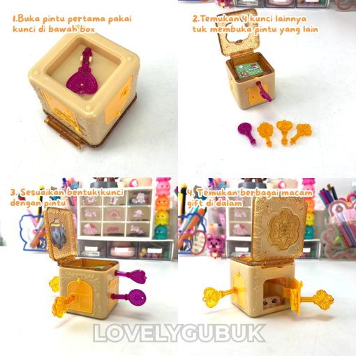 Mainan ini adalah kotak misteri edukatif yang mengajak anak bermain sambil belajar melalui aktivitas membuka kunci dan menemukan kejutan di dalamnya.