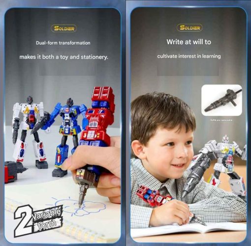 Desain 2-in-1 – Bisa digunakan sebagai pulpen dan diubah menjadi figur robot transformer.