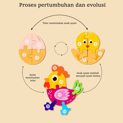 Anak dapat menyusun urutan perubahan hewan (misalnya telur – larva – pupa – dewasa) sambil melatih logika, konsentrasi, dan koordinasi tangan-mata.