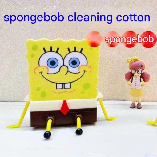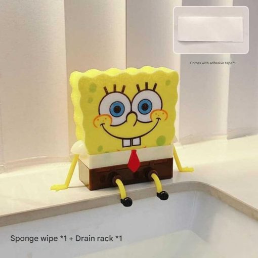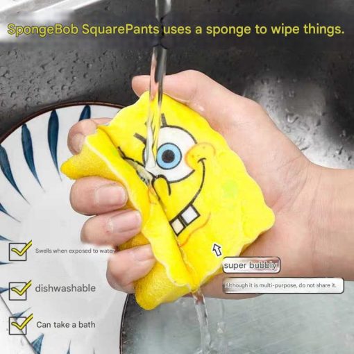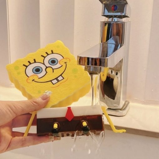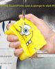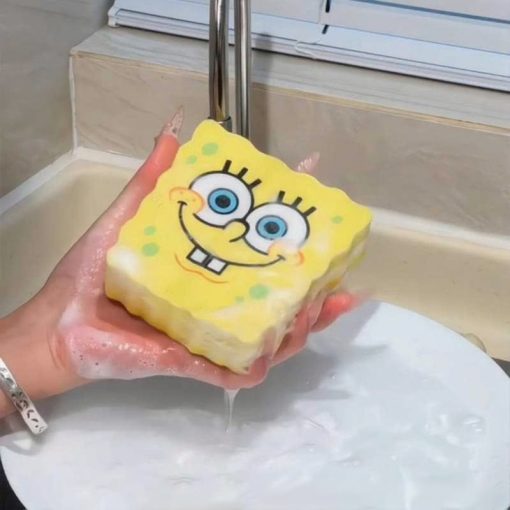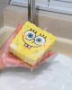 Spons cuci piring dengan bentuk karakter kotak lucu berwarna kuning yang memberikan kesan ceria di area dapur. Teksturnya lembut namun efektif membantu membersihkan permukaan peralatan makan.