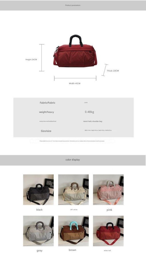 Menggunakan material kain berkualitas yang ringan dan mudah dibersihkan, tas ini dirancang agar tahan lama dan nyaman digunakan. Terdapat pegangan tangan empuk serta tali panjang yang bisa diatur agar sesuai dengan preferensi pengguna. Kompartemen utama cukup besar untuk menyimpan barang bawaan seperti pakaian, botol minum, perlengkapan gym, dan gadget. Kantong depan memberikan akses cepat untuk barang kecil seperti kunci, dompet kecil, atau charger. Pilihan warna seperti black, off white, pink, grey, brown, dan wine red memberikan fleksibilitas gaya untuk berbagai suasana.