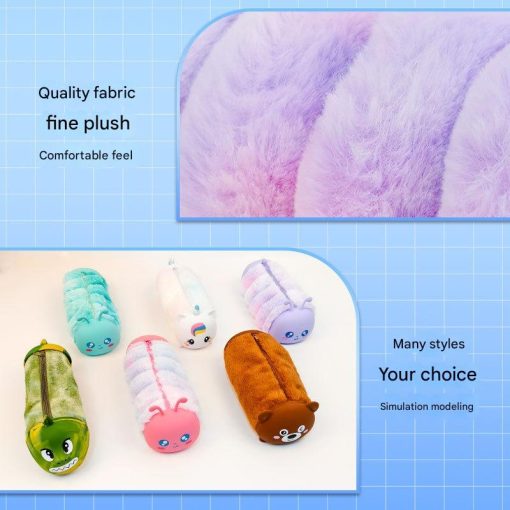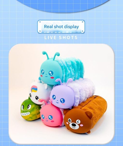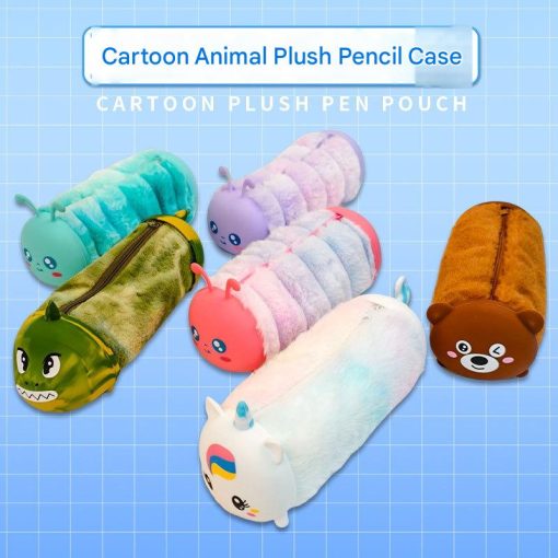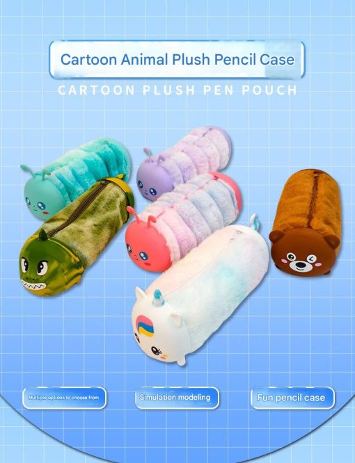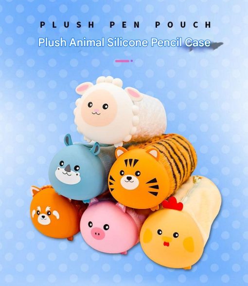 Tempat pensil plush karakter ini menggabungkan bahan bulu lembut dengan kepala silikon bergambar hewan yang imut. Desainnya silindris dan mudah dibuka tutup dengan ritsleting, cocok untuk menyimpan alat tulis atau aksesori kecil. Warna dan motif hewan yang beragam membuatnya menarik digunakan sehari-hari.