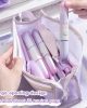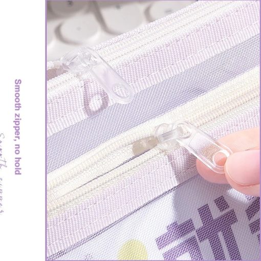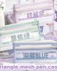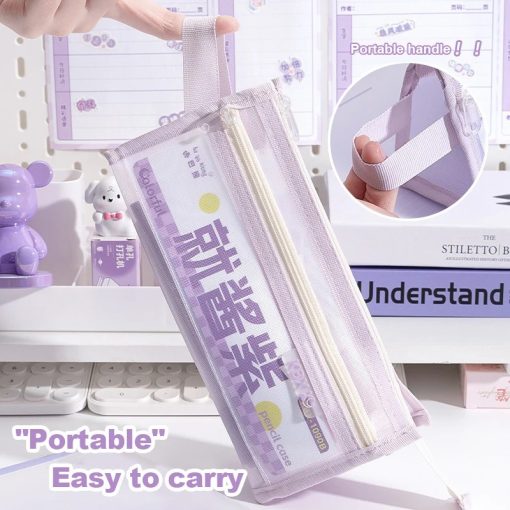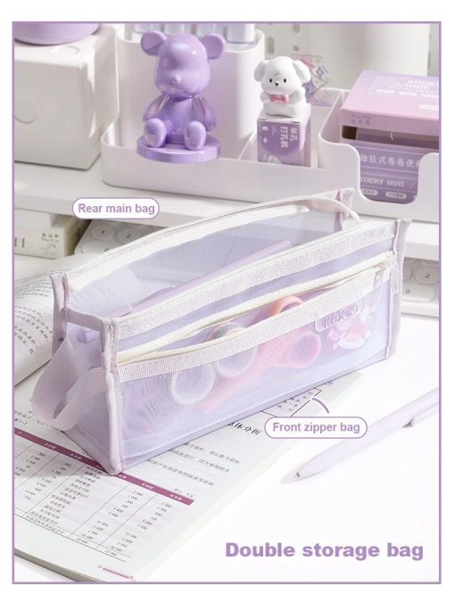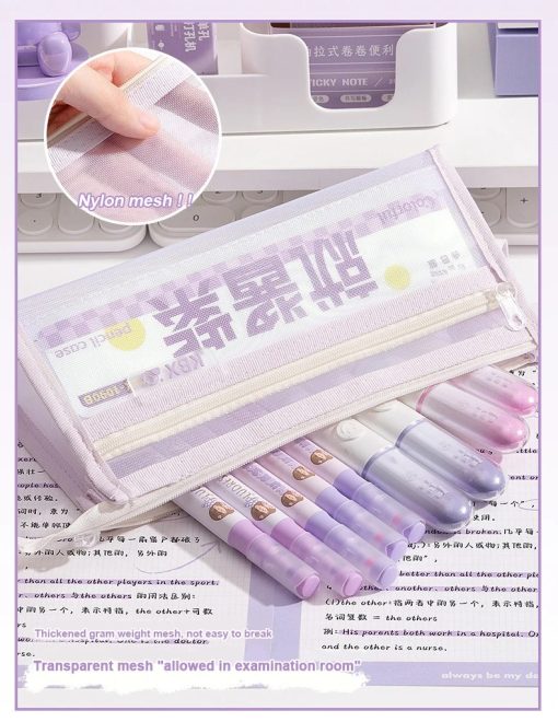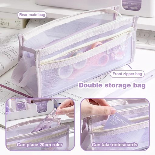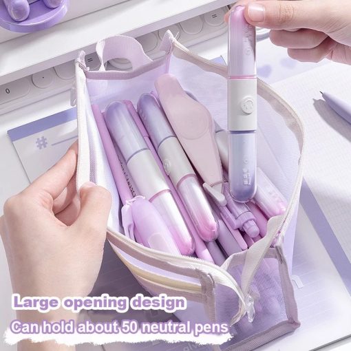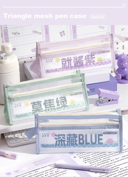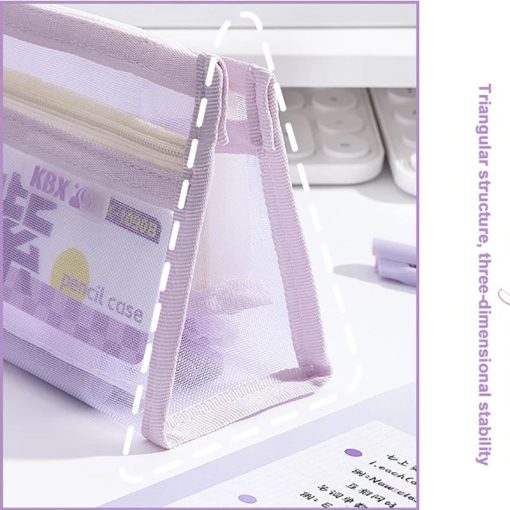 Tempat Pensil dengan desain transparan dan bahan mesh yang ringan namun kuat. Memiliki kapasitas besar dengan dua lapisan penyimpanan, sehingga memudahkan menyimpan berbagai alat tulis seperti pensil, pulpen, penghapus, dan spidol. Struktur segitiga yang stabil membuat tas lebih kokoh dan tidak mudah jatuh saat diletakkan di meja.